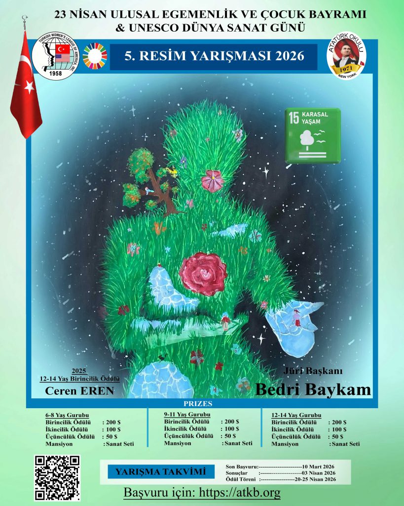 Türkiye Cumhuriyetin kurucusu Büyük Önder Gazi Mustafa Kemal Atatürk’ün tüm dünya çocuklarına armağan ettiği 23 Nisan Ulusal Egemenlik ve Çocuk Bayramı, geleceğe yönelik sorumluluklarımızı bir kez daha hatırlatmaktadır. Birleşmiş Milletler Küresel İletişim Departmanı (UNDGC) üyesi olan ve New York Atatürk Okulu’nun kurucusu Türk Amerikan Kadınlar Birliği (ATKB), UNESCO Dünya Sanat Günü’ne katkı sağlamak amacıyla “KARADA YAŞAM” temalı bir resim yarışması düzenlemektedir.